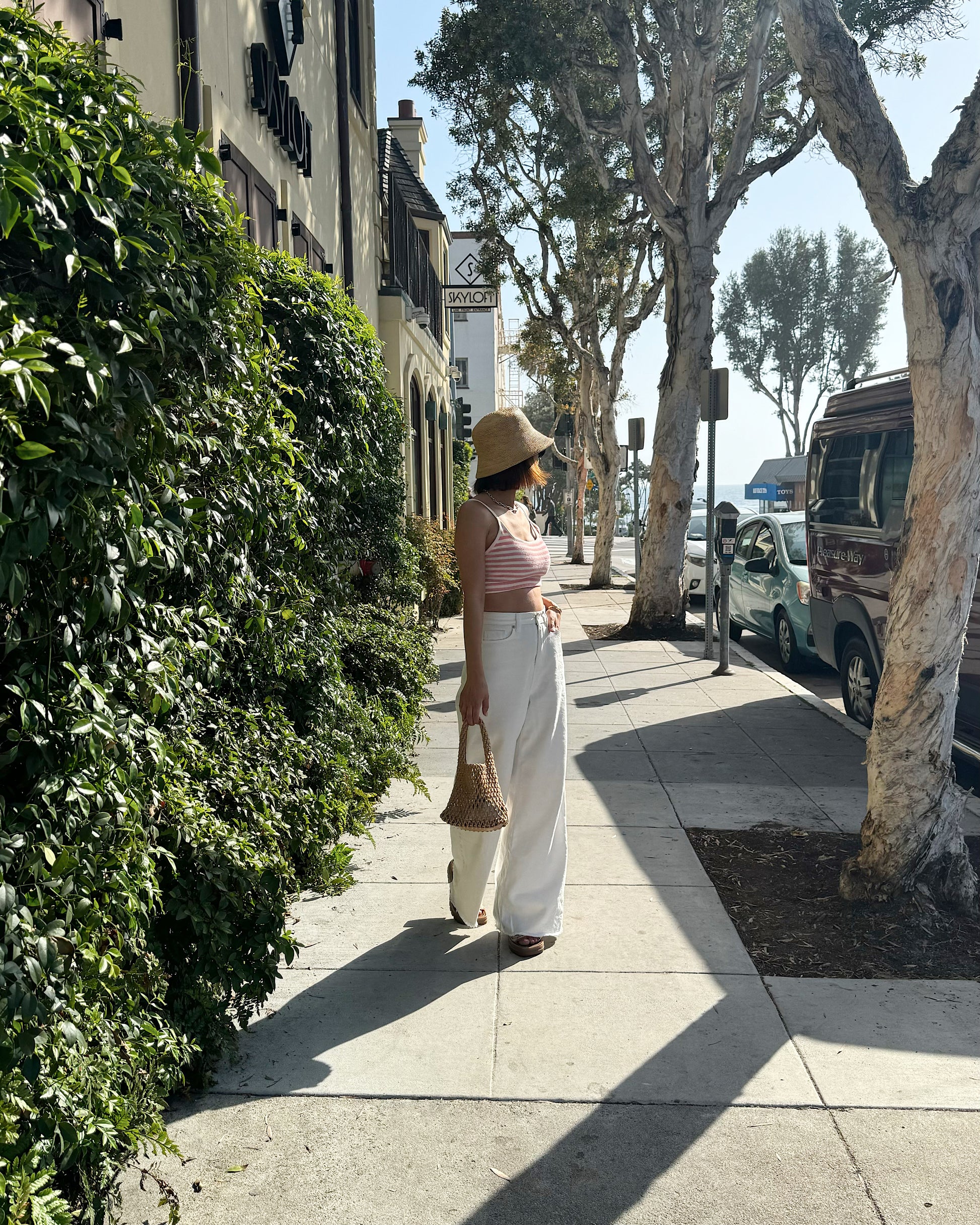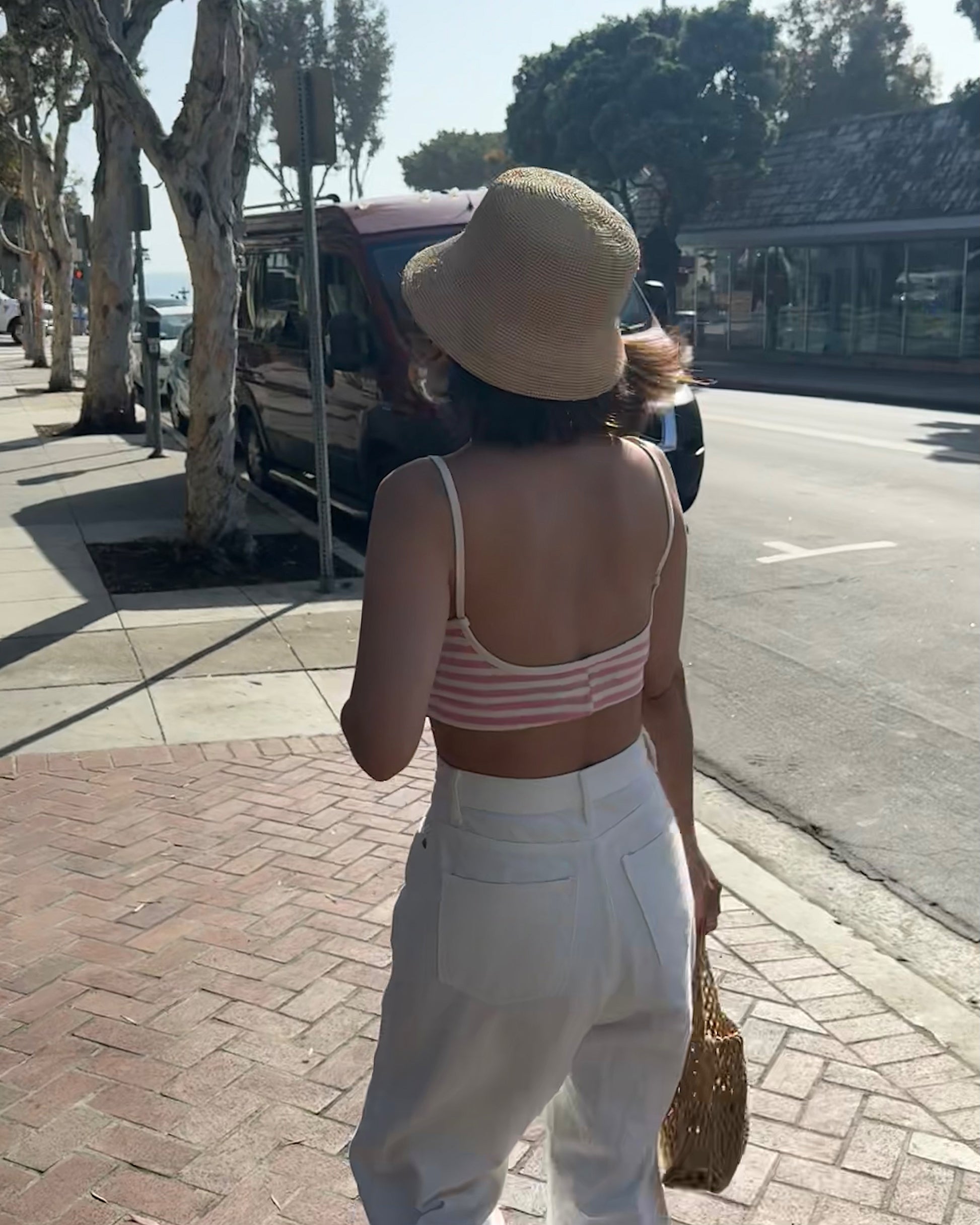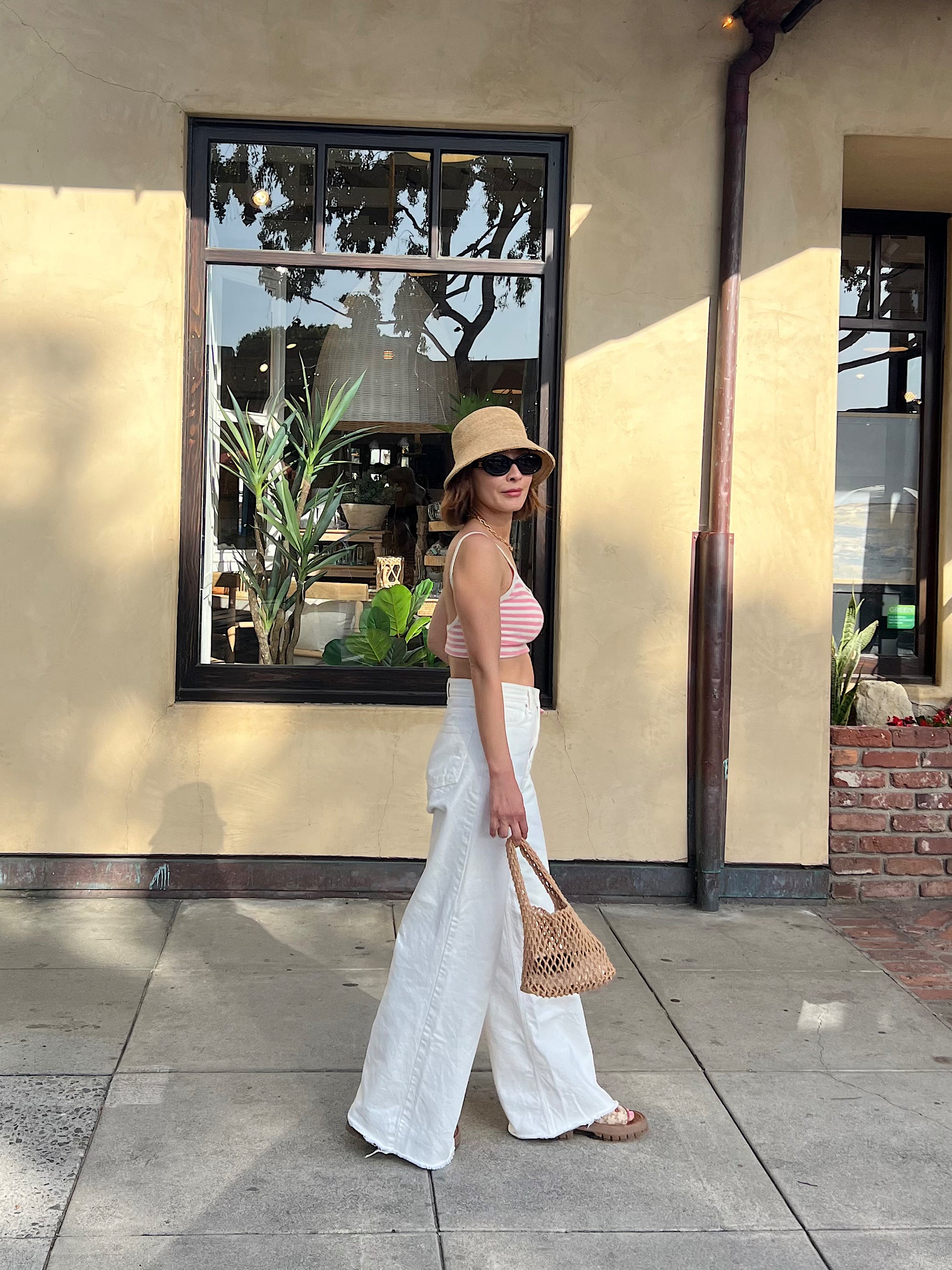 Angela is 5'4" size S and wearing terry beach set top and net mini bag.